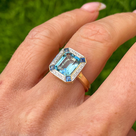 9ct Gold Blue Topaz, Sapphire & Diamond Deco Ring