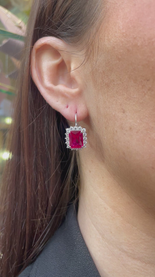 Silver Red CZ Emerald Cut Cluster Stud Earrings | German Wires