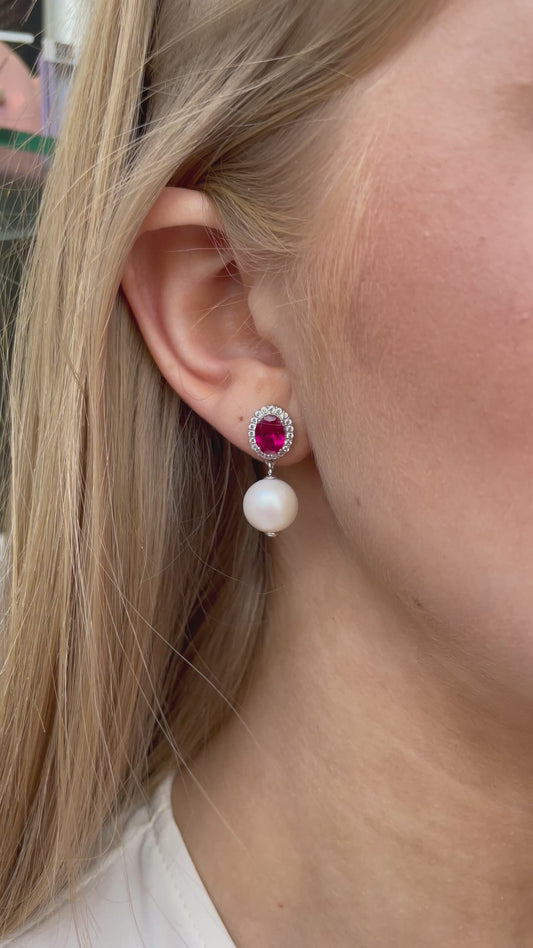 Silver Ruby Red CZ & 10mm Freshwater Pearl Drop Earrings