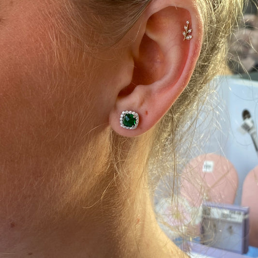 Silver Cushion Halo Stud Earrings | Emerald Green