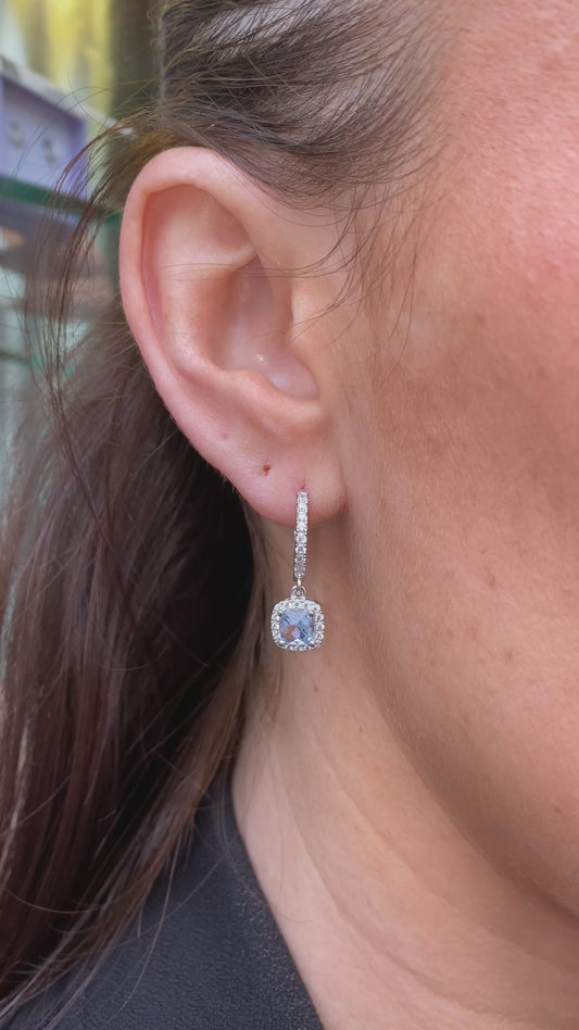 Silver Aqua Halo CZ Hoop Drop Earrings