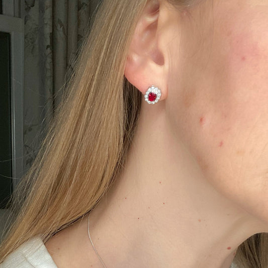 Silver Created Ruby CZ Vintage Oval Stud Earrings