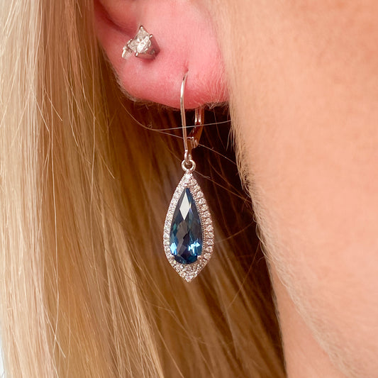 18ct White Gold London Blue Topaz & Diamond Drop Earrings | 0.40ct
