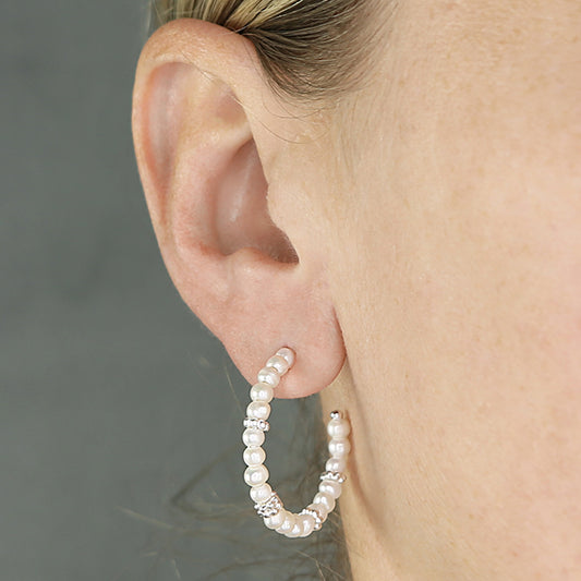 Silver Freshwater Pearl & Mini Bead Hoop Earrings | 28mm