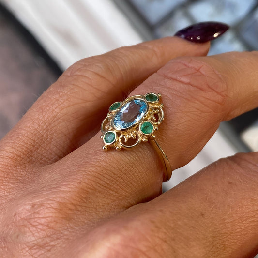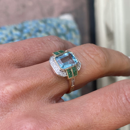 9ct Gold Blue Topaz, Emerald & Diamond Ring
