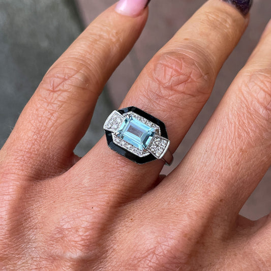Platinum Blue Topaz, Onyx & Diamond Cocktail Ring | 1.70ct
