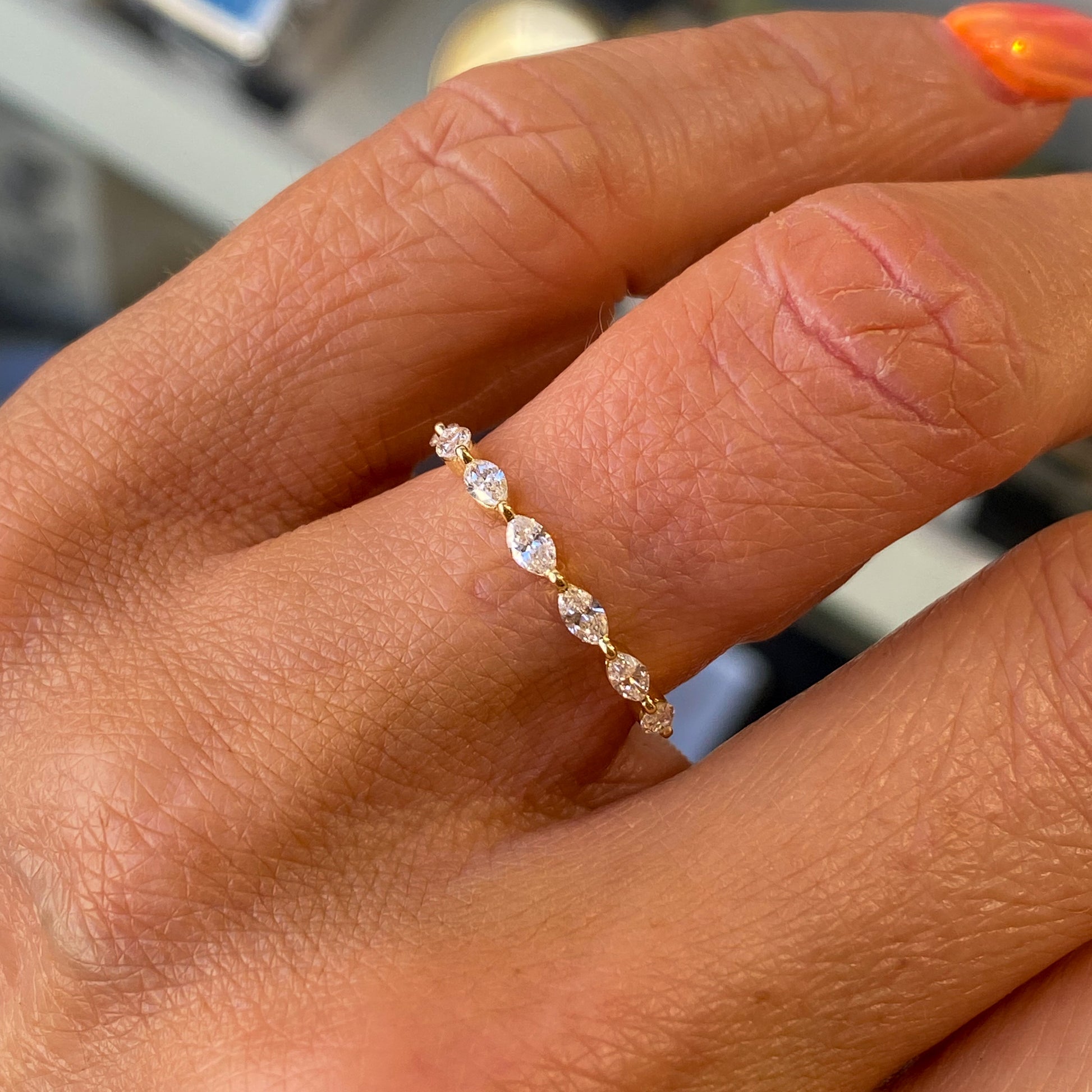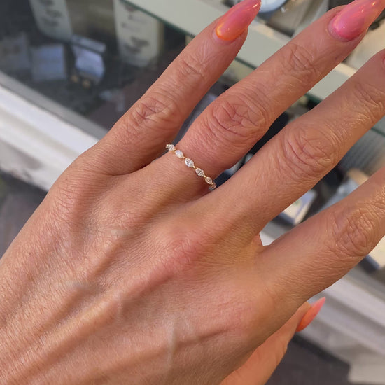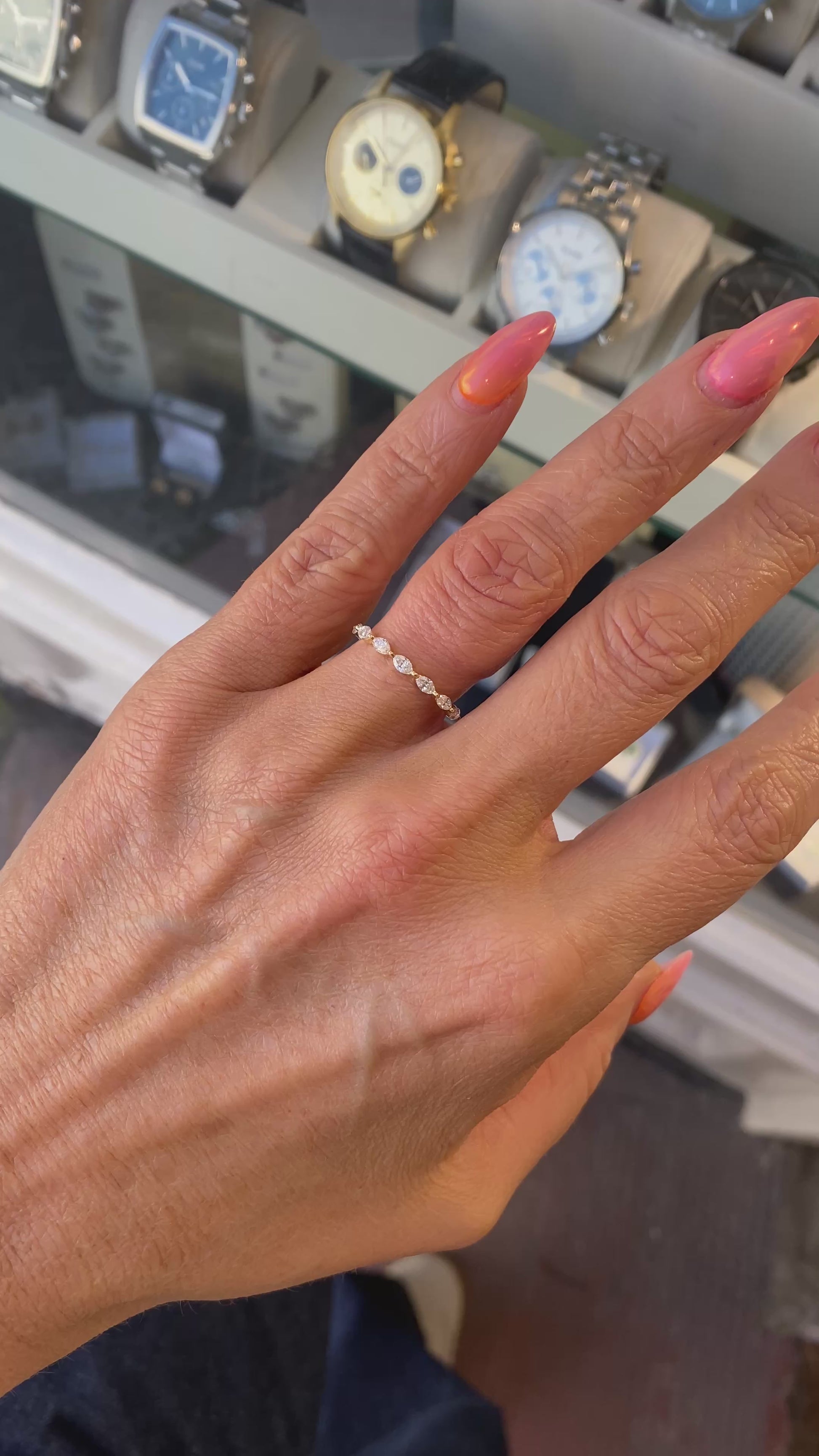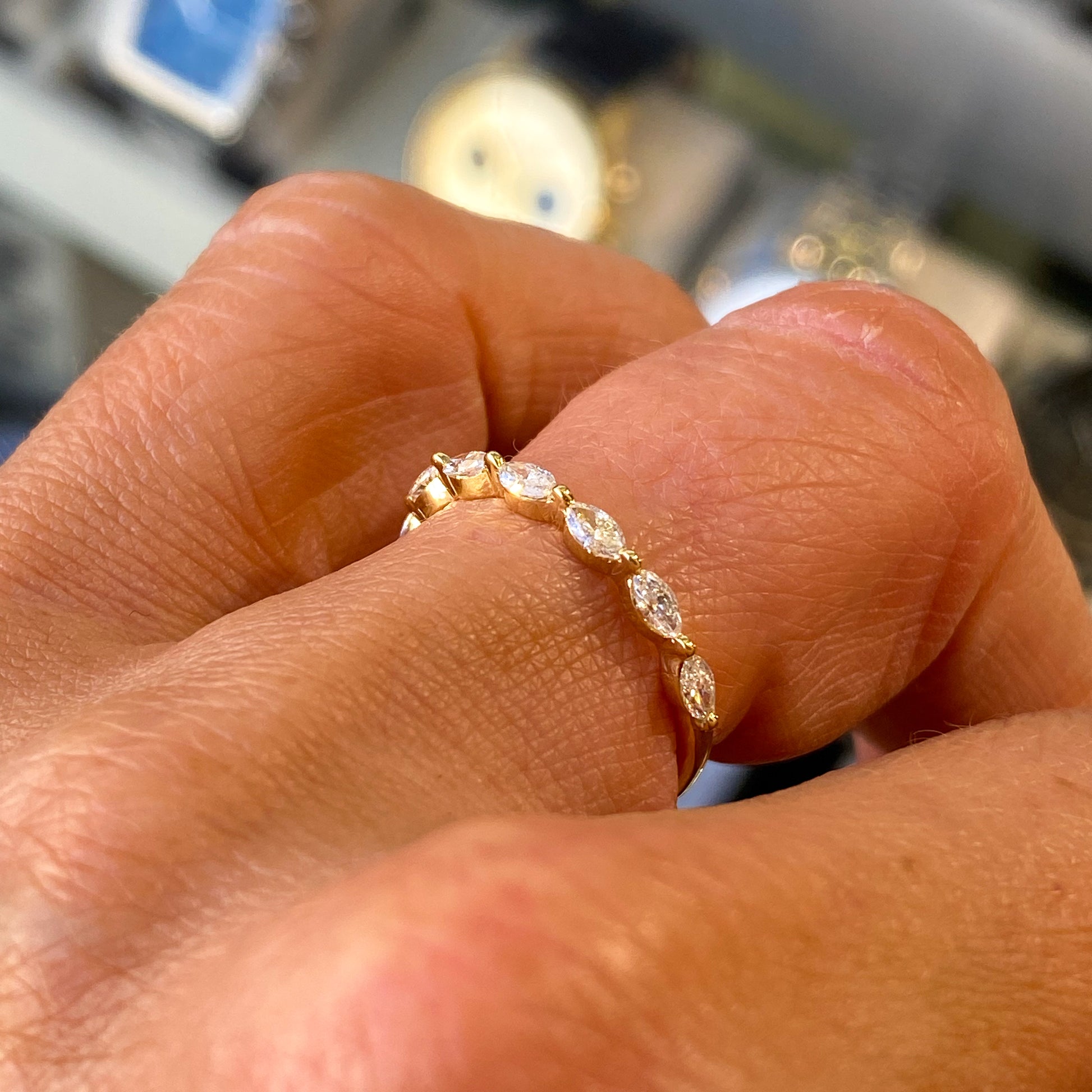 18ct Gold diamond eternity or wedding ring set with seven marquise cut diamonds. Half set shank. 0.50ct in total. G colour. SI clarity. 2mm diameter.