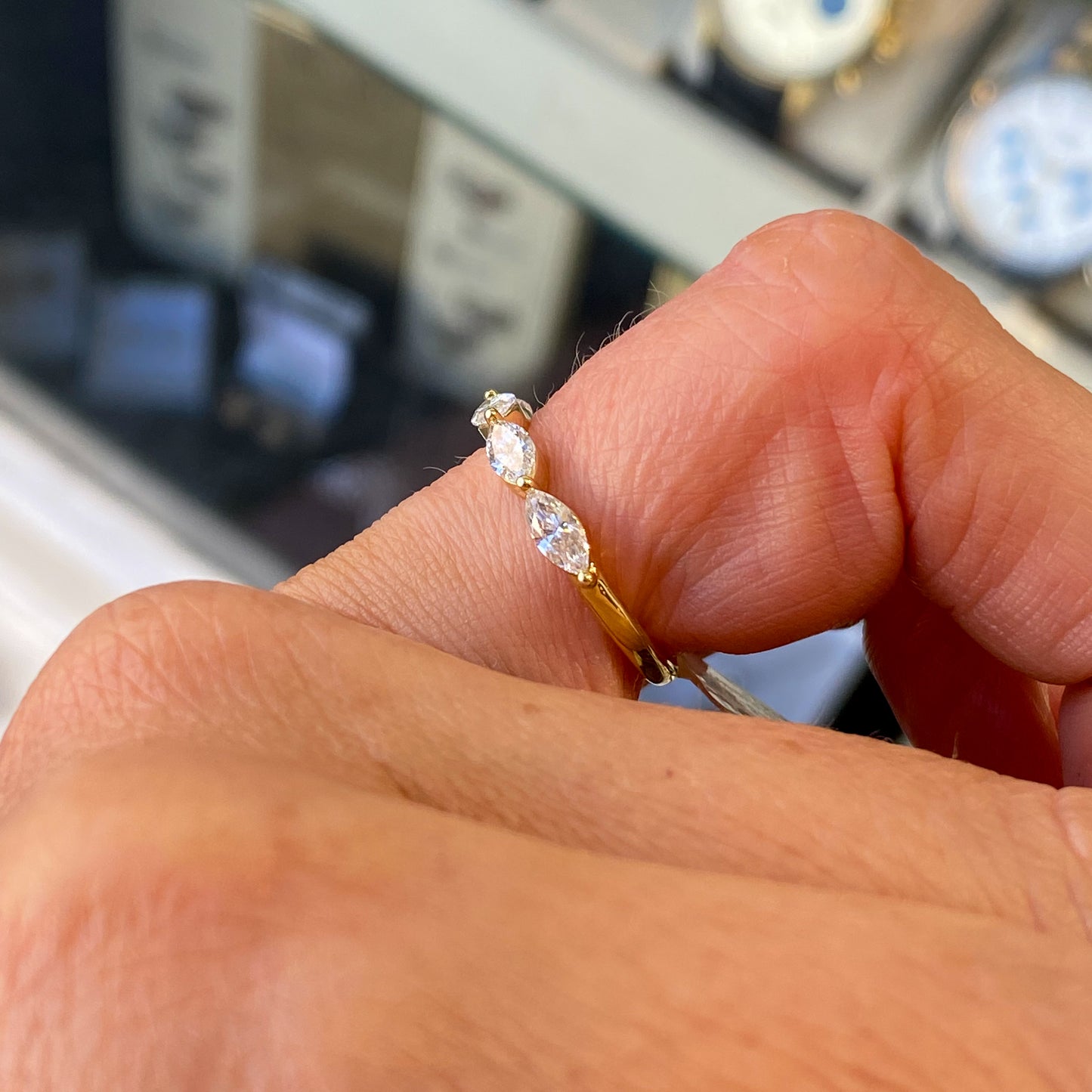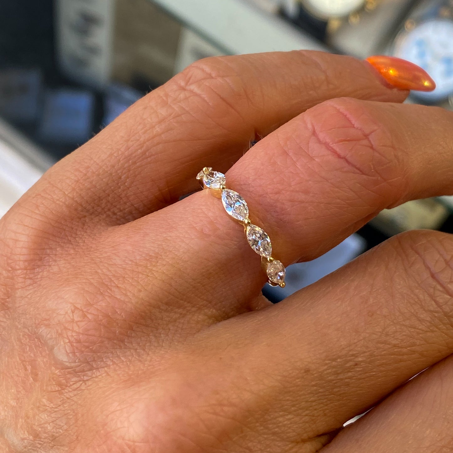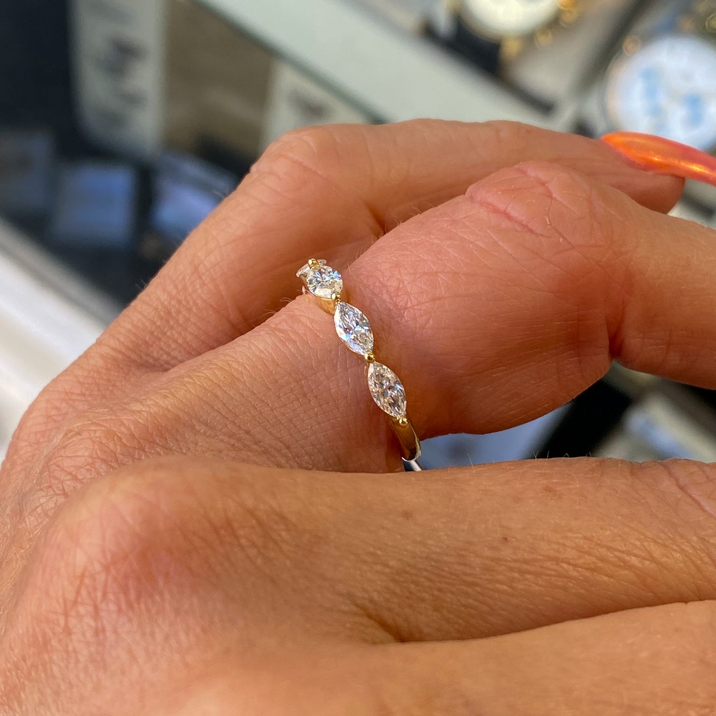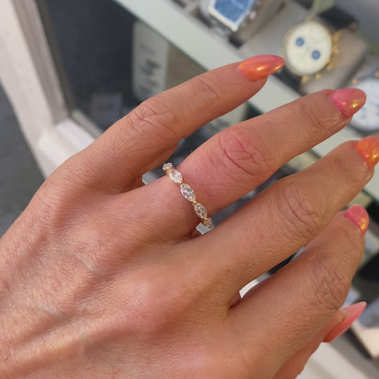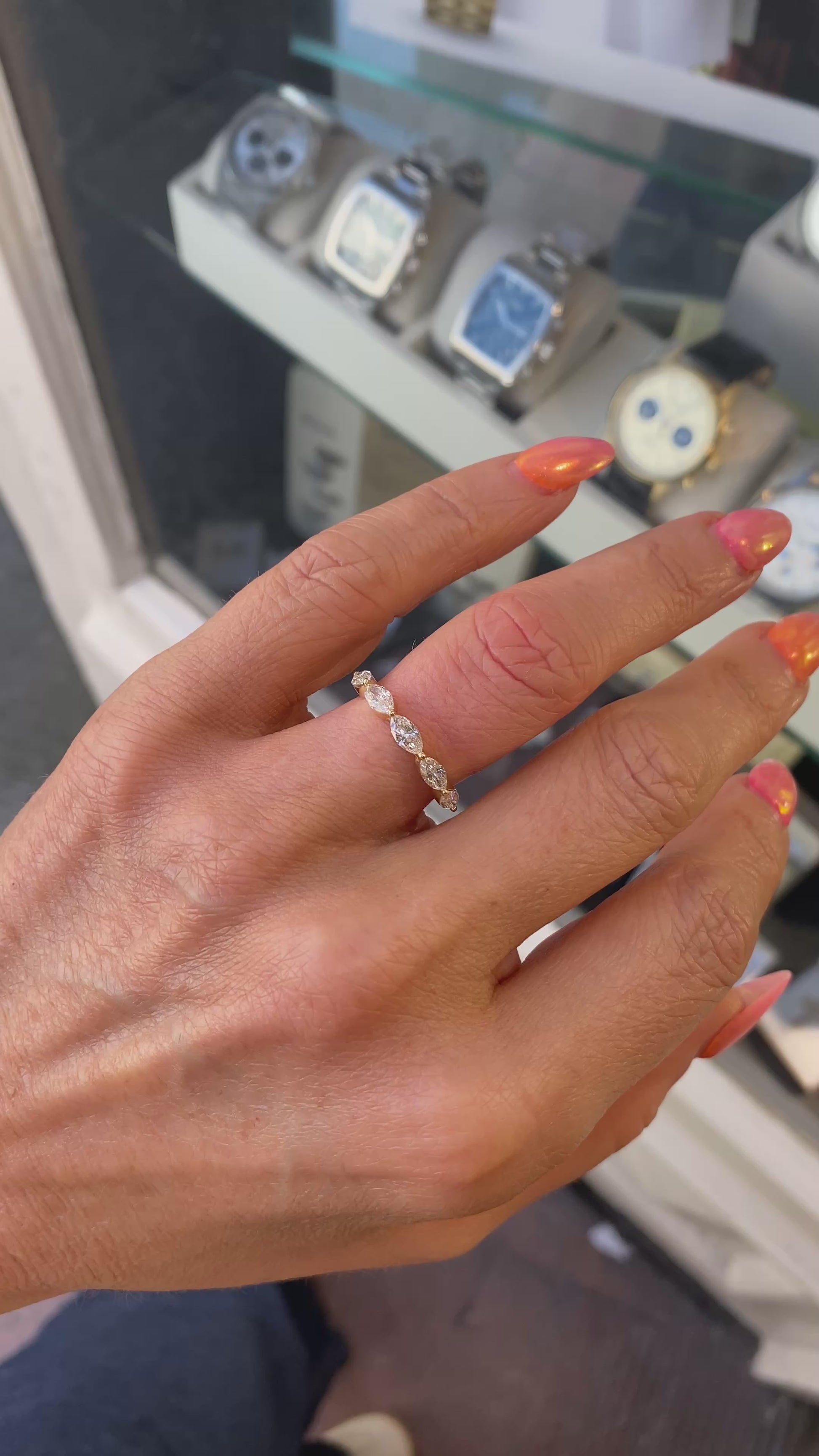 18ct Gold diamond eternity or wedding ring set with five marquise cut diamonds. Half set shank. 0.96ct in total. G colour. SI clarity. 2mm diameter.