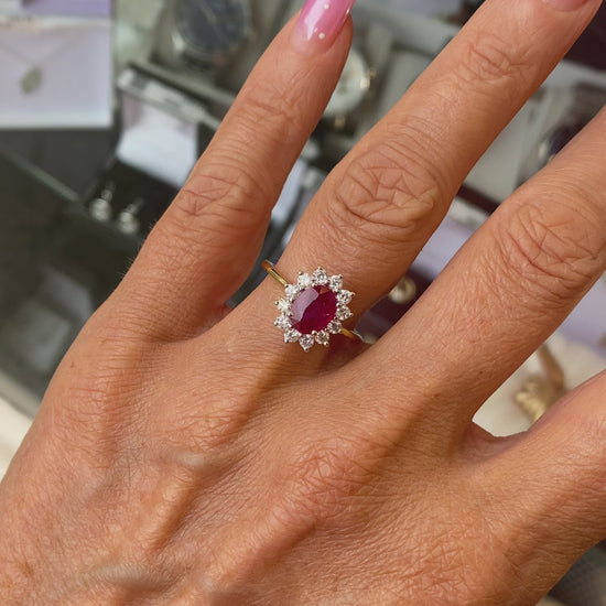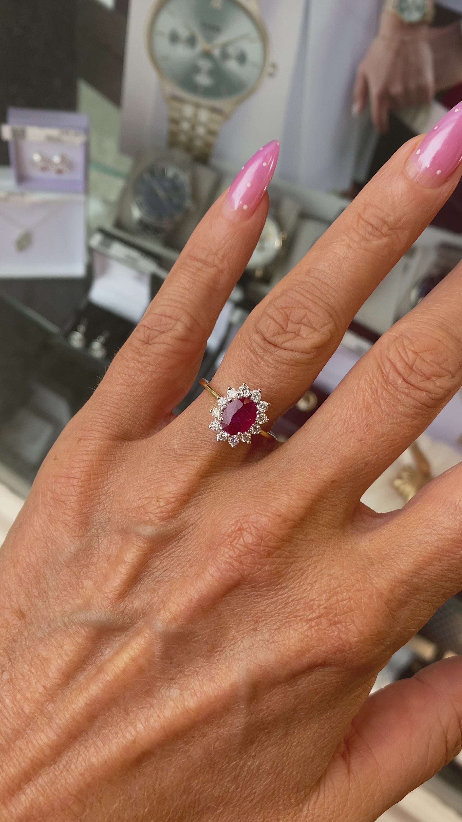 18ct Gold Ruby & Diamond Oval Cluster Ring | 1.69ct Oval Cut Ruby + 0.49ct of round brilliant cut diamonds
