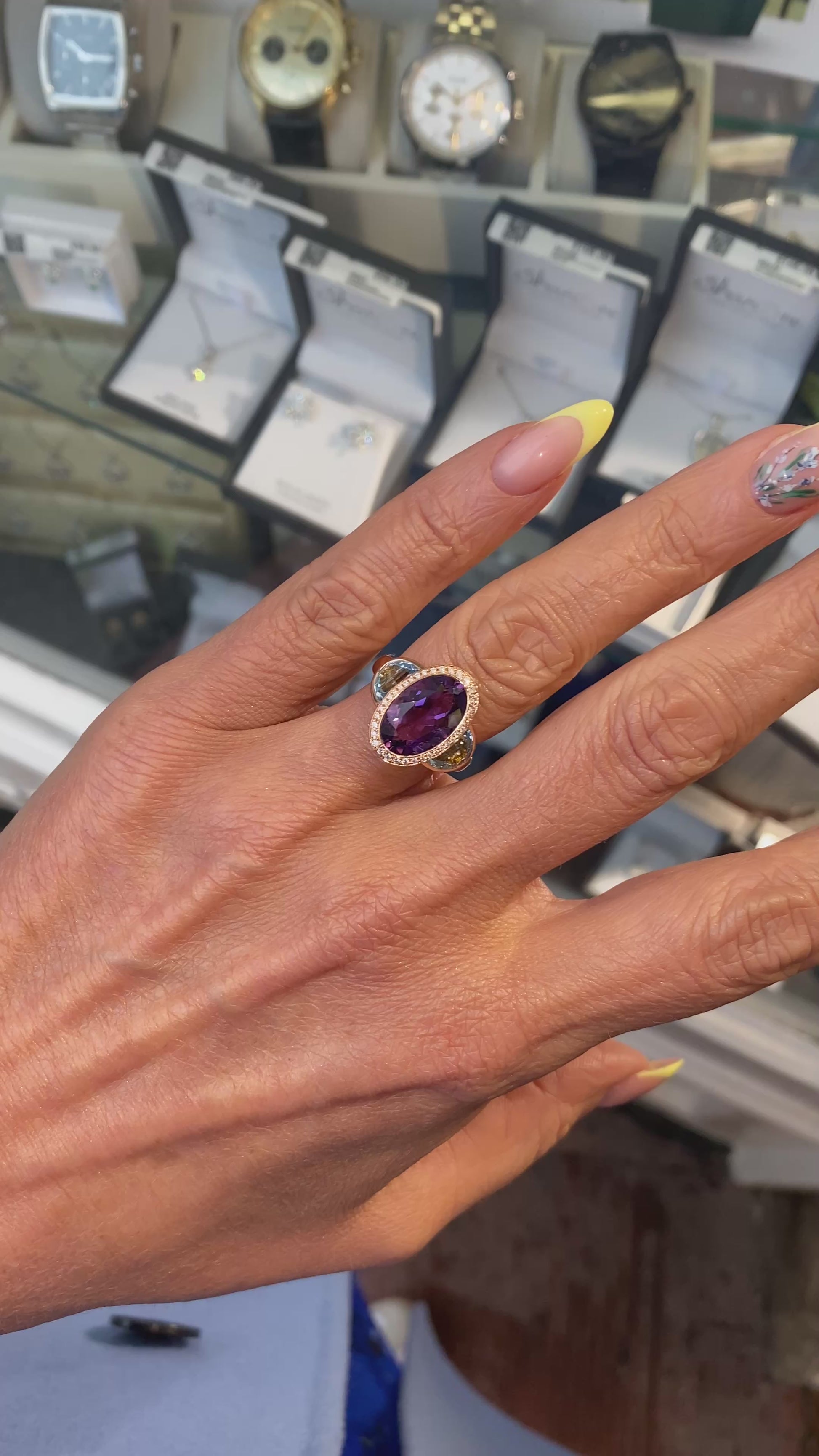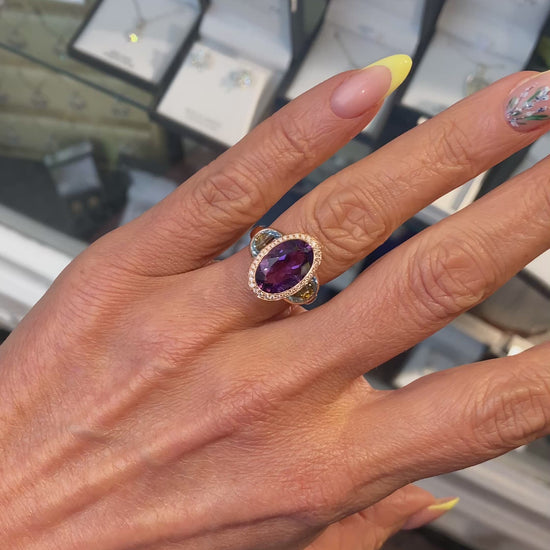 18ct Rose Gold Amethyst, Blue Topaz & Diamond Ring