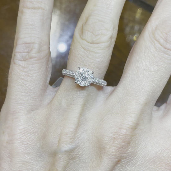 One 18ct white gold diamond engagement ring. Diamond halo cluster in a round shape with pavé diamond-set shoulders. 0.74ct in total of diamonds. Colour G. Clarity VS.