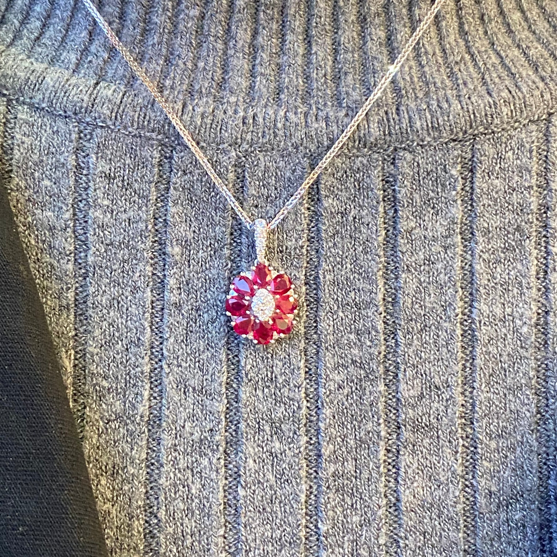 This delicate necklace comprises concentric pear cut rubies surrounding a melee of round brilliant cut diamonds, in an 18ct white gold setting and a 18ct white gold fine chain with carabiner clasp.