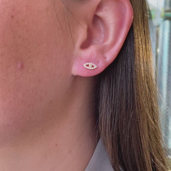 These delightful evil eye stud earrings feature sparkling CZs, beautifully framed in gold. Perfect for adding a touch of whimsy to any outfit, they are ideal for both casual and formal occasions. Show your love for unique accessories with these charming pieces.
