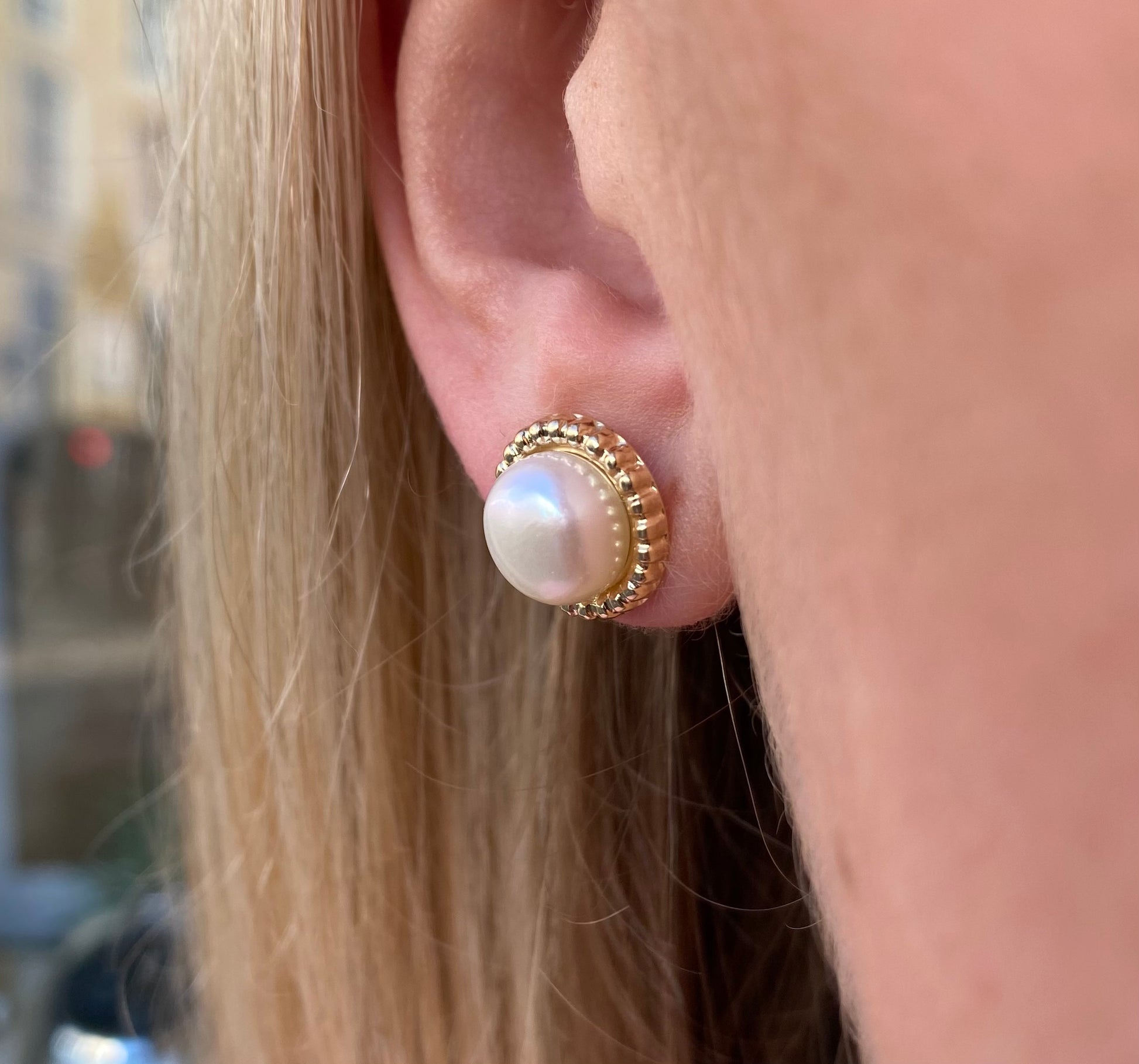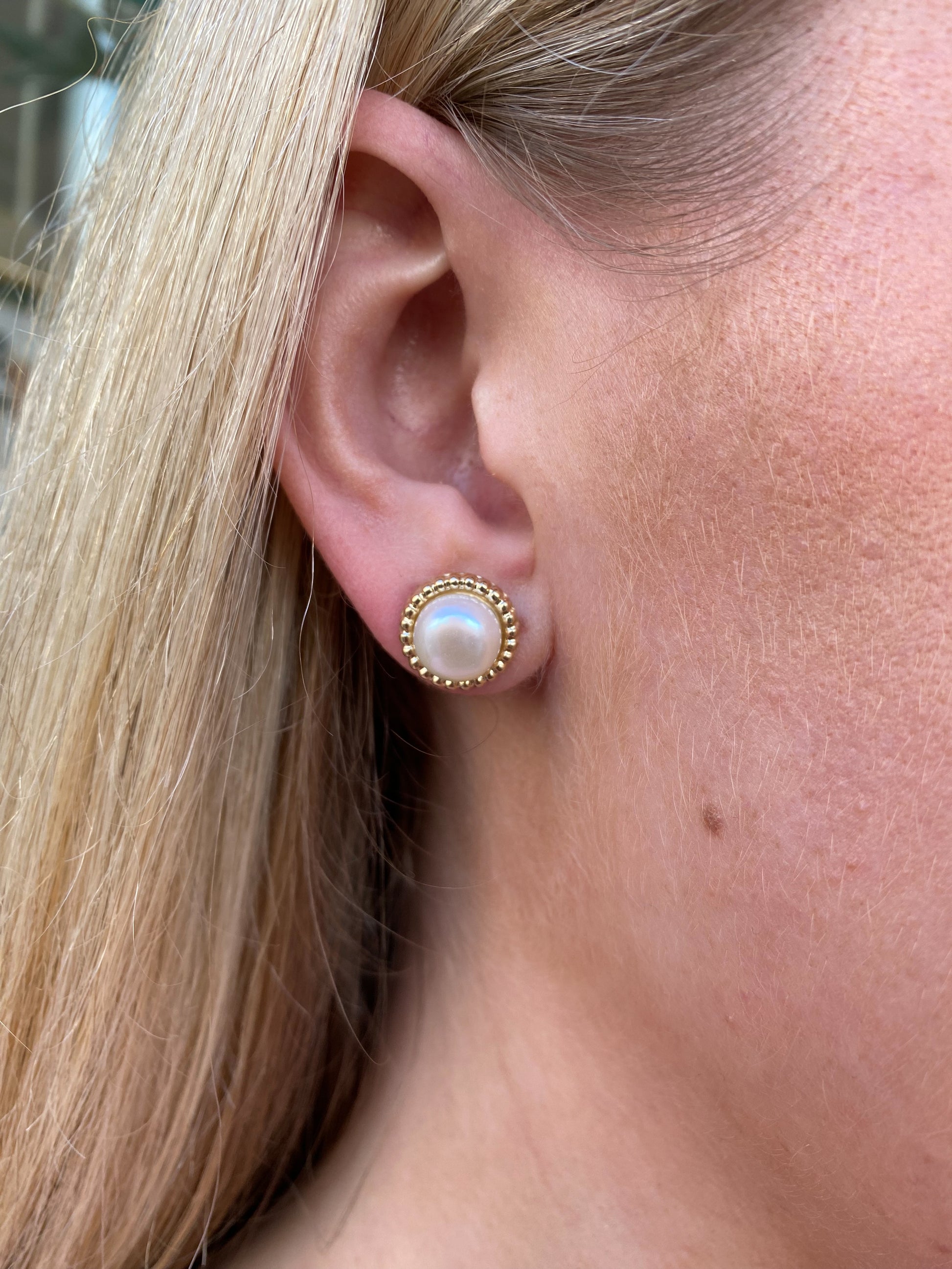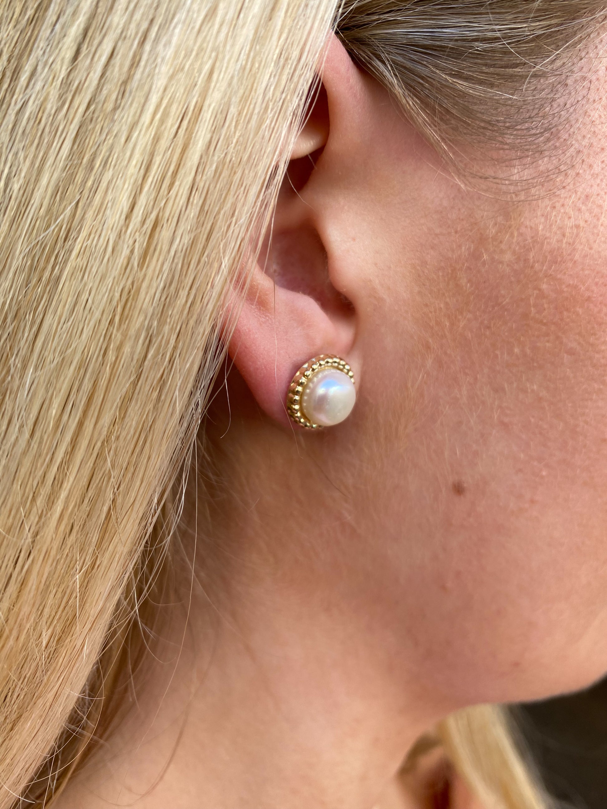 9ct Gold Freshwater Pearl Button Stud Earrings with beaded gold surround.