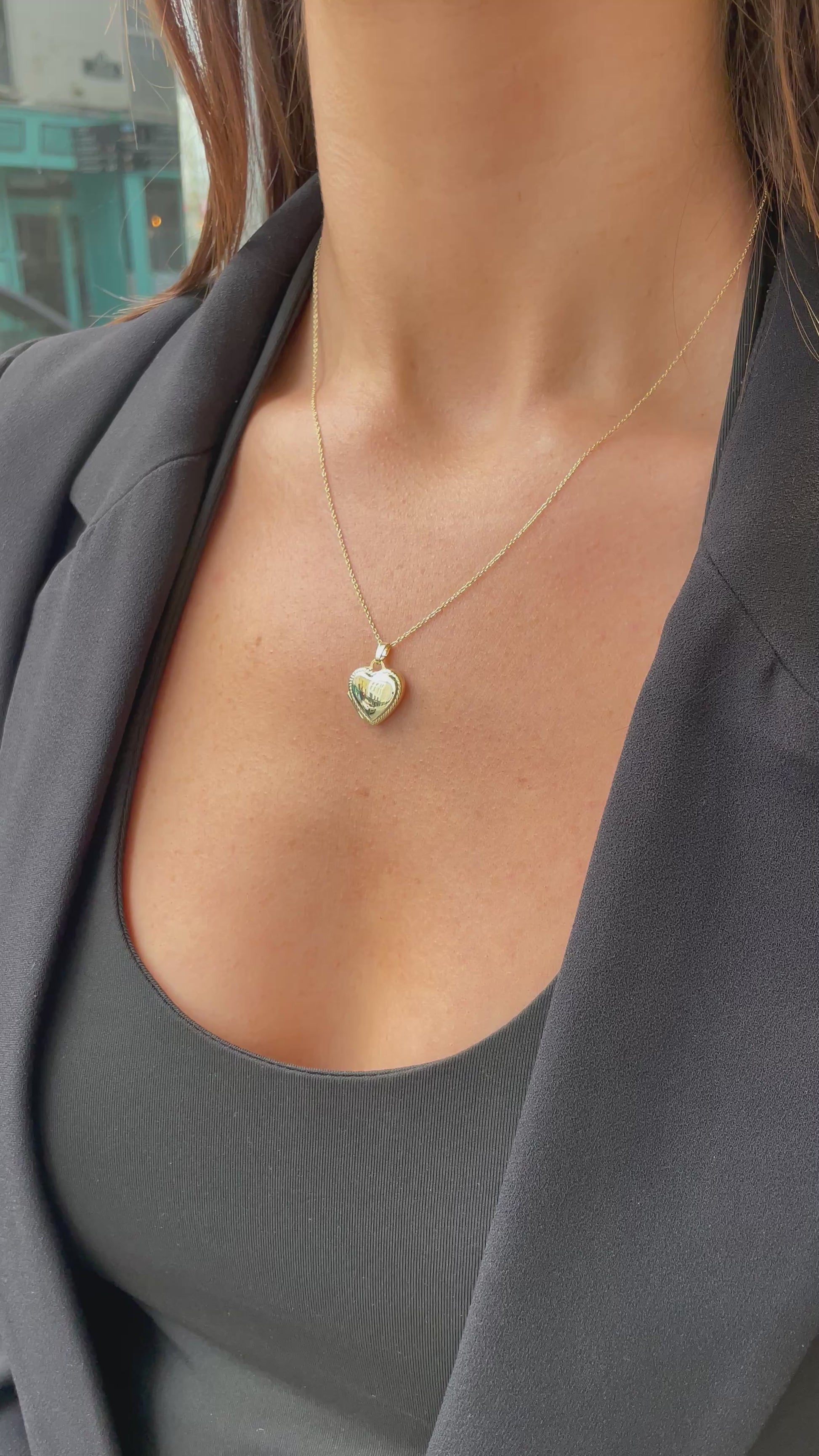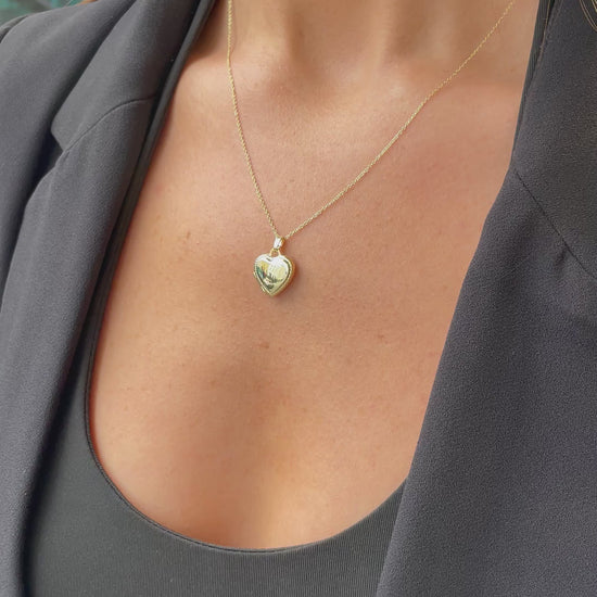 This 9ct yellow gold small to medium heart shaped locket holds two photos. It has a polished finish front with a braided edge and and matte finish on the back. It can be engraved front and back. It hangs from a 9ct yellow gold 18" trace chain, which can also be worn at 16" long. This is so classic and stylish. A completely "wear anytime" piece.
