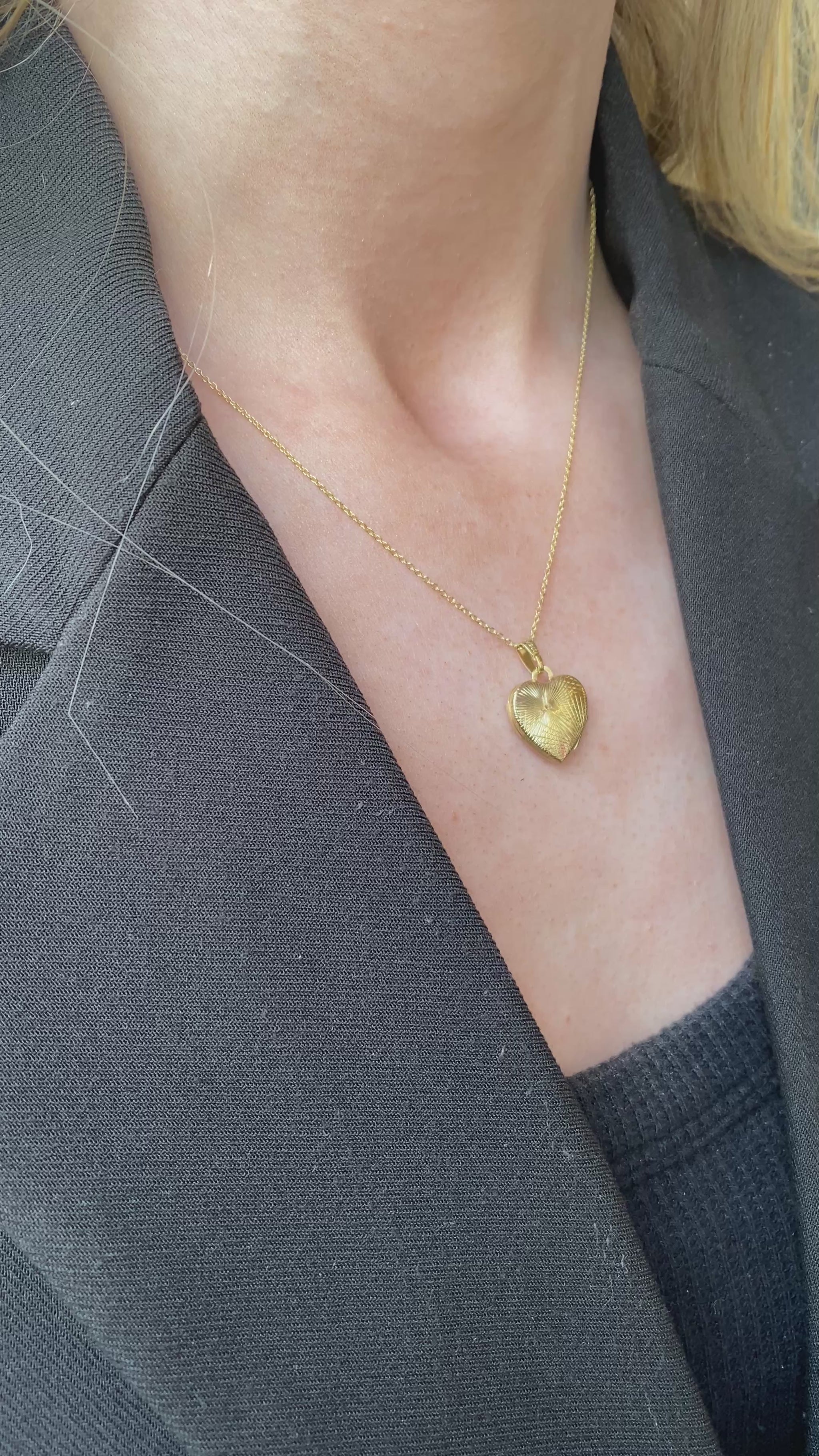 This 9ct yellow gold small to medium heart shaped locket holds two photos. It has a sunbeam design on the front and back.. It hangs from a 9ct yellow gold 18" trace chain, which can also be worn at 16" long. This is so classic and stylish. A completely "wear anytime" piece.