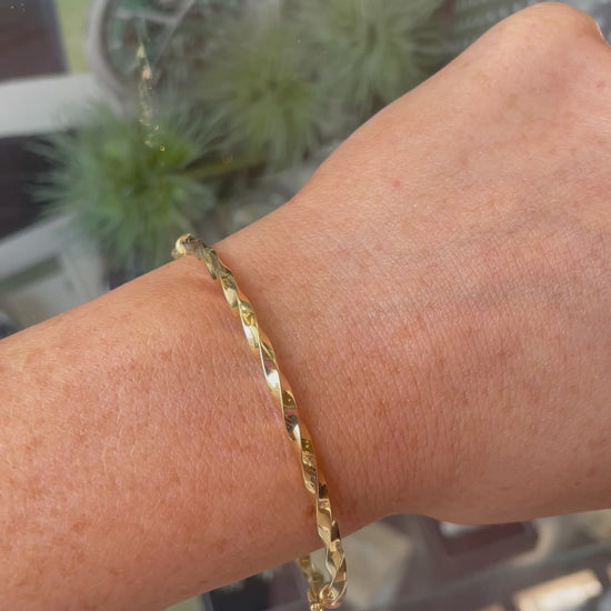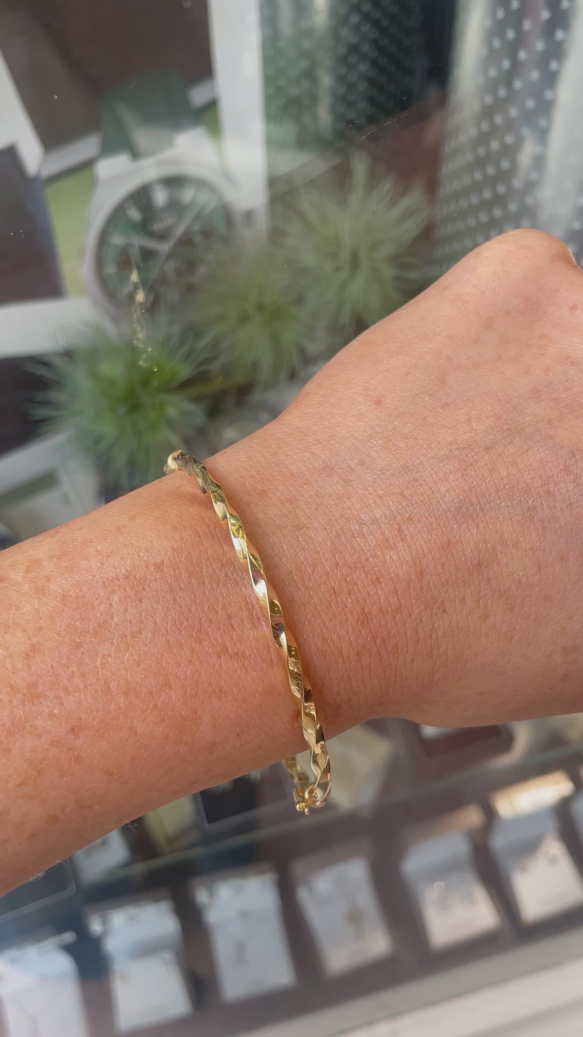 Turn heads with this dazzling 9ct yellow gold bangle! Featuring stunning twist patterning, it's as comfortable as it is eye catching, beaming with shine like you won the celebrity lottery. Make your wrists sparkle! 🤩