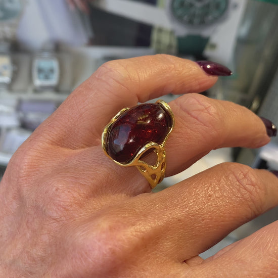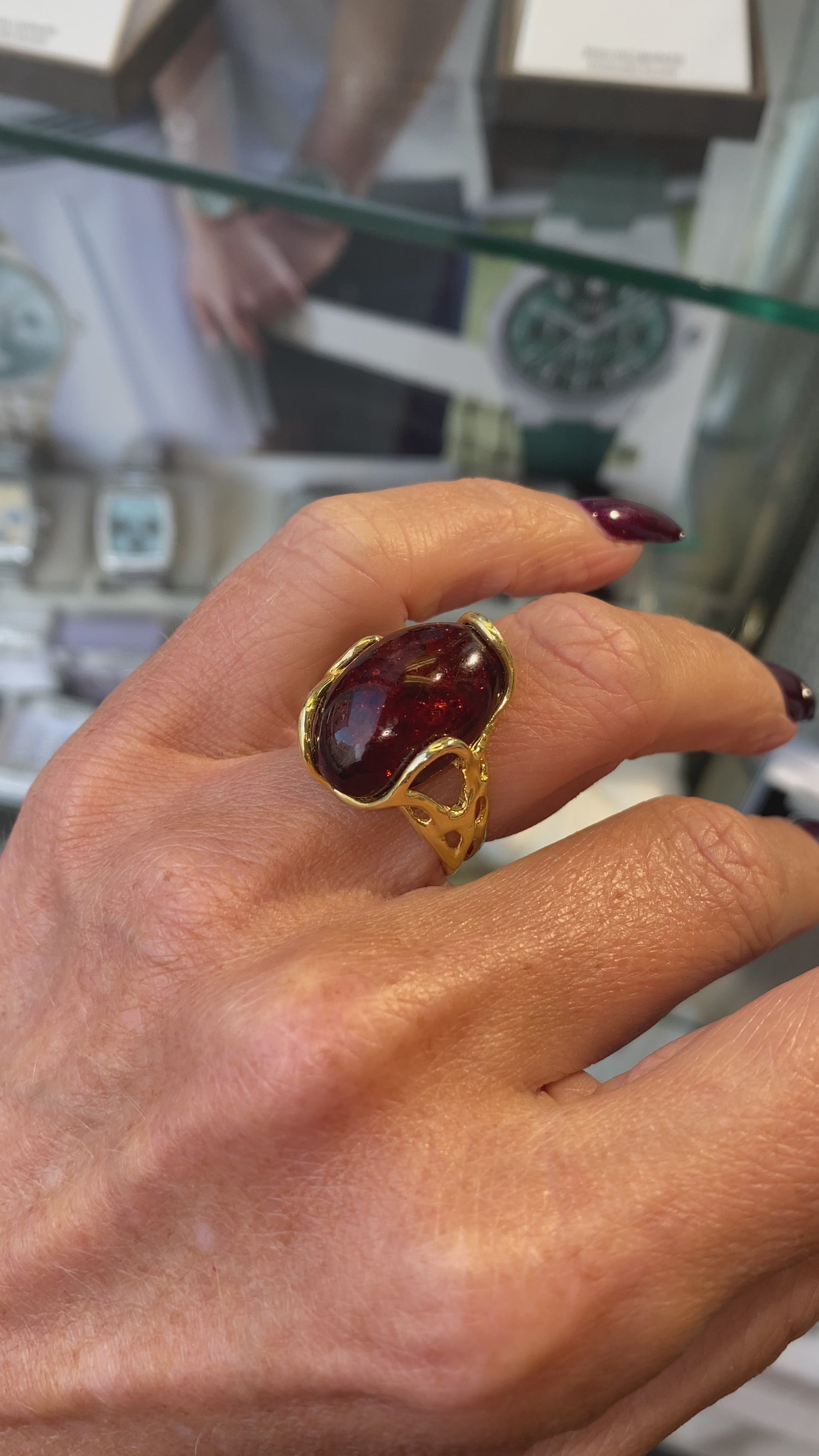 925 Silver Gold Plated Natural Amber Ring. Handmade in Italy. Adjustable to fit your finger. Small to Medium.