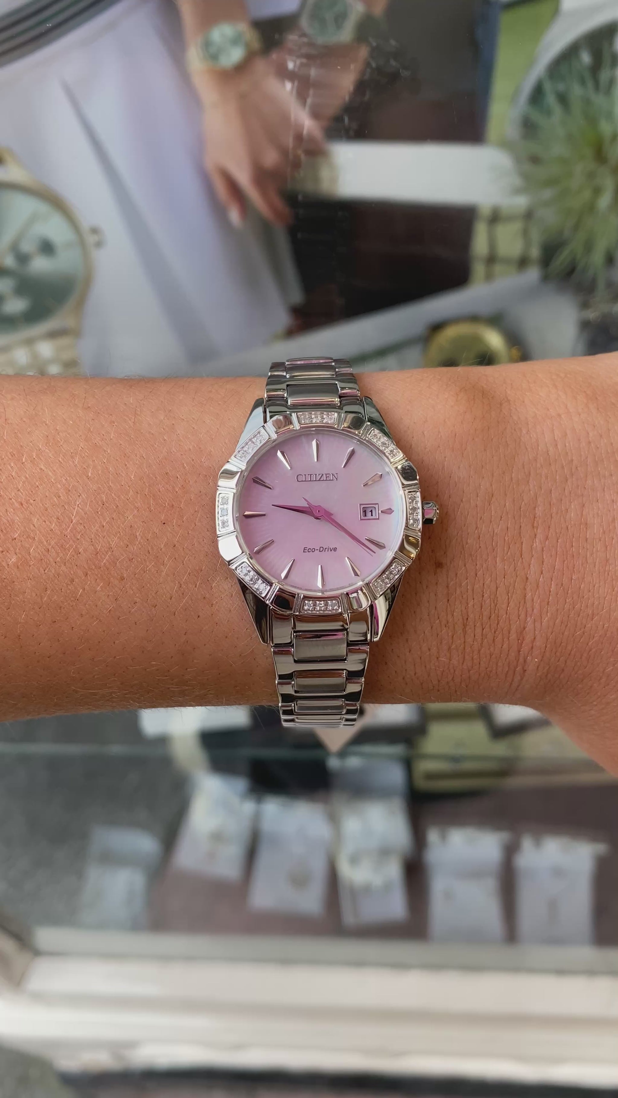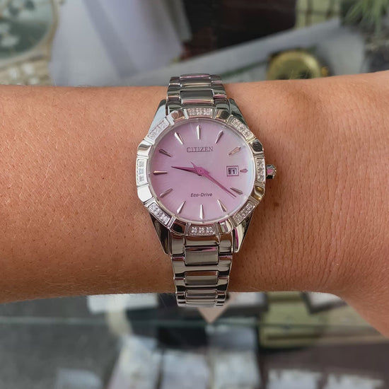 Effortlessly elegant day-to-night wear with the Ladies' Diamond from Citizen. With 24 diamonds hand-set on a striking octagonal bezel, this timepiece is a style must-have. Styled with a stainless-steel case and bracelet with a beautiful white Mother-of-Pearl dial showing glimpses of blue as it catches the light, as well as a handy date window. Sustainably powered by light with Citizen Eco-Drive technology.