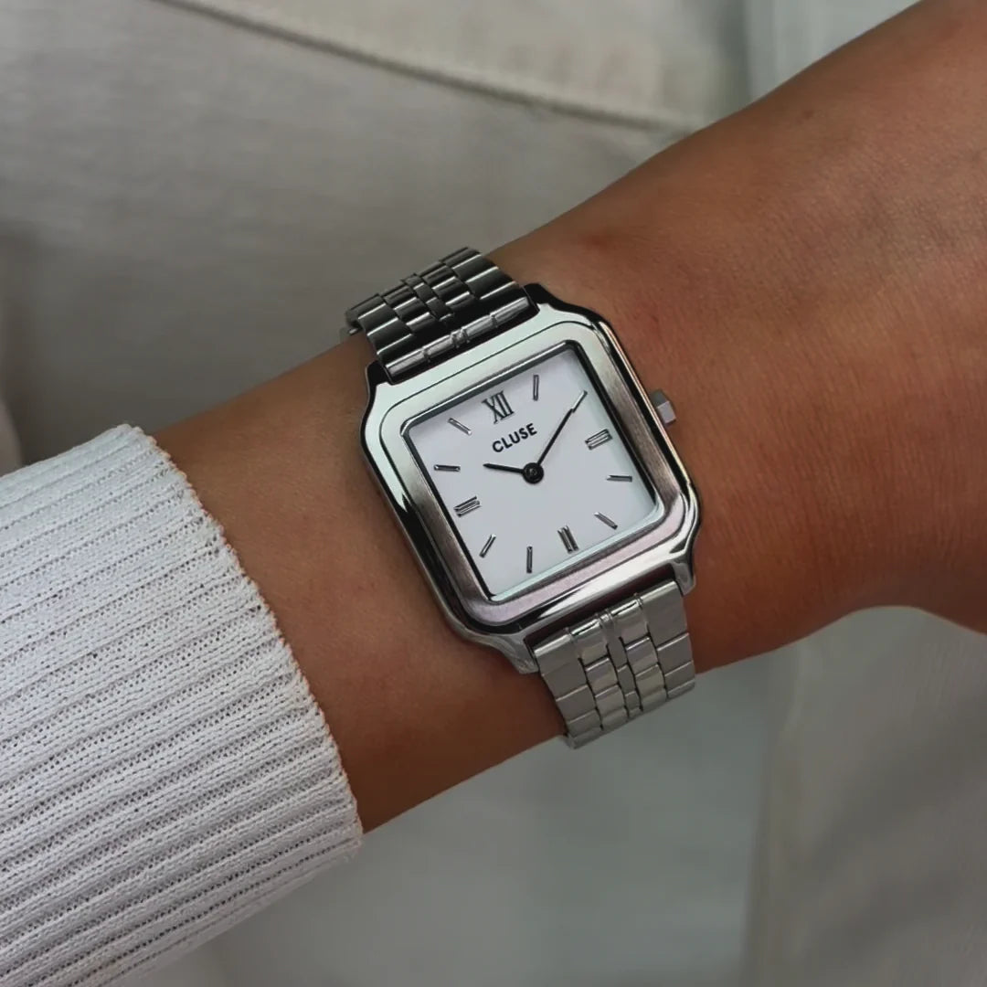 A gracious addition to any watch collection: the Gracieuse watch for women. Featuring a square 28 mm silver colour case, white dial and 16 mm stainless steel silver coloured 5-link strap. This silver coloured eye-catcher will add a glamorous vintage touch to all of your looks. Easily customise the look of your watch with any 16 mm strap. You can easily adjust the strap size by yourself.