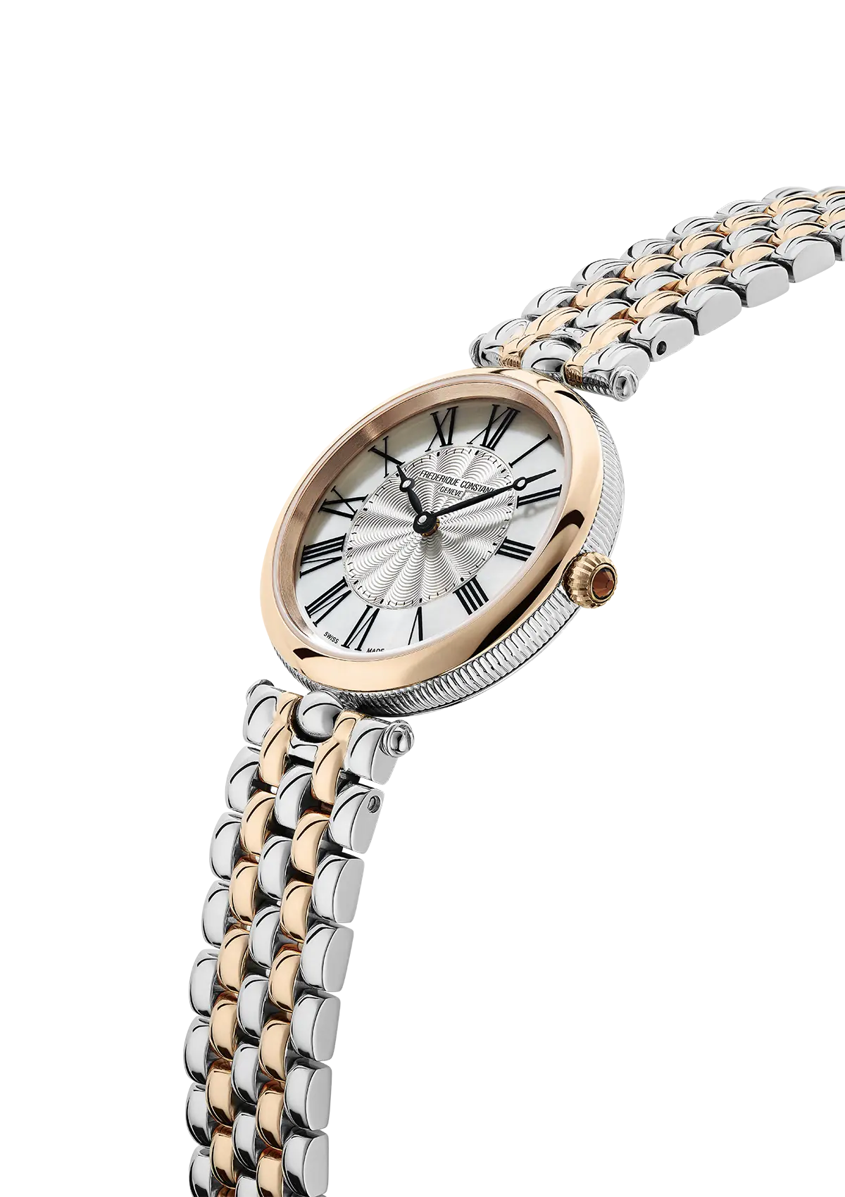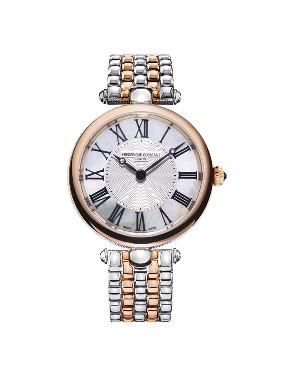 Boasting bold lines and an elegant shape and style, thanks to its delicate round 30mm case, Roman numerals and guilloché-patterned mother-of-pearl dial, the Classics Art Déco Round model is equipped with a cabochon-adorned crown for a refined, high jewellery-like aesthetic that evokes classic women's watches.