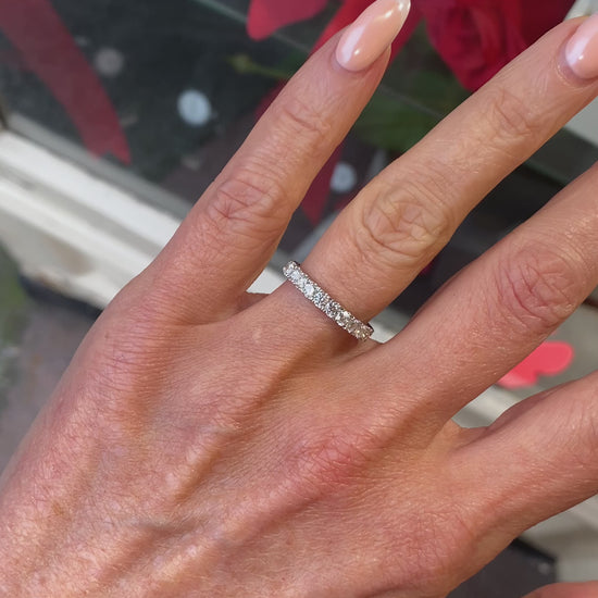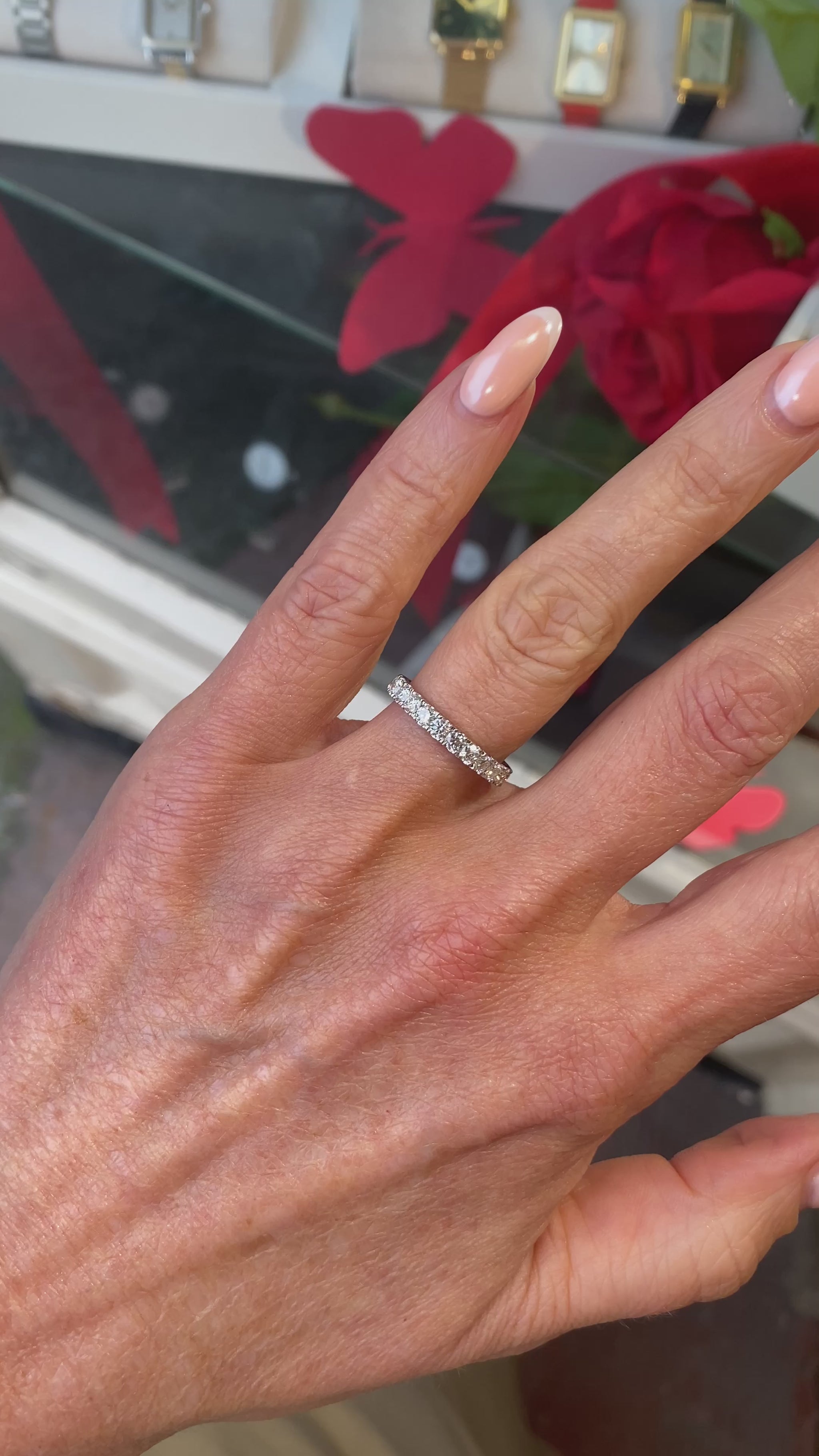Platinum diamond eternity or wedding ring set with fourteen round brilliant cut diamonds. 60% set shank. 1.00ct in total. G colour. SI clarity. 3mm diameter.