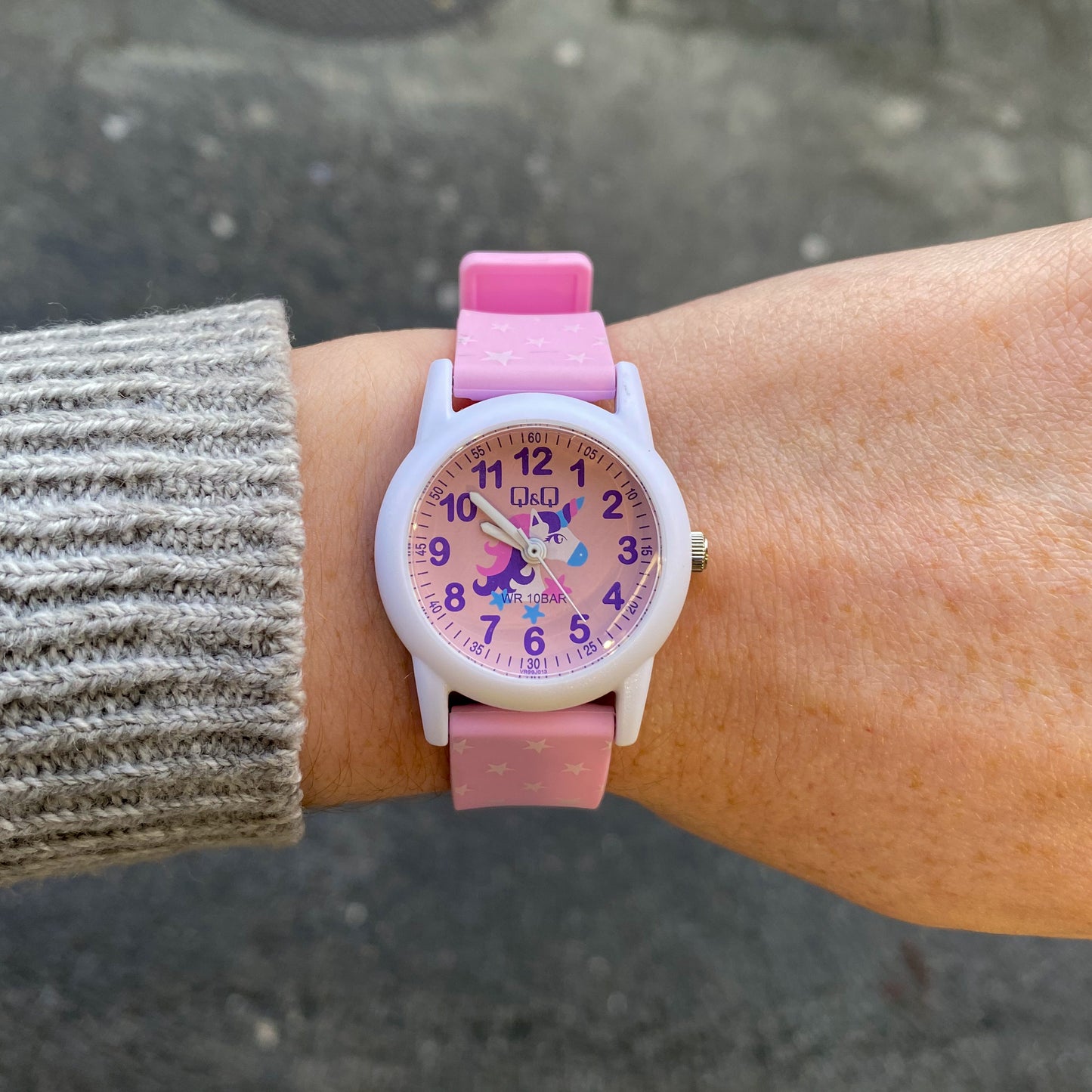 This kids Q&Q watch has a comfortable light pink silicone strap with a white star design and a white bezel. The light pink dial is adorned with a unicorn.
