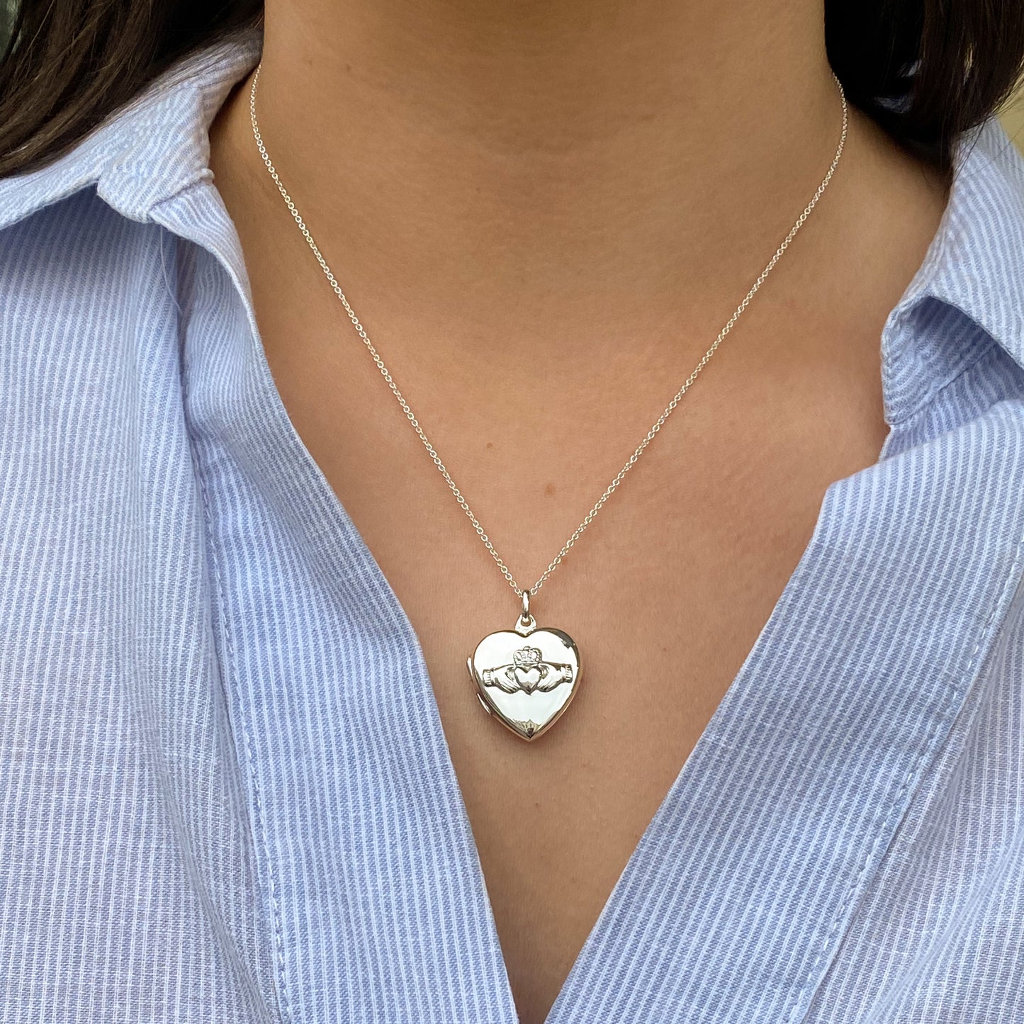 This 925 silver oval locket holds two photos. It has the Claddagh symbol embossed in relief on the front. It can be engraved on the back. It hangs from a 925 silver fine 18" chain. This is so classic and stylish. A completely "wear anytime" piece.