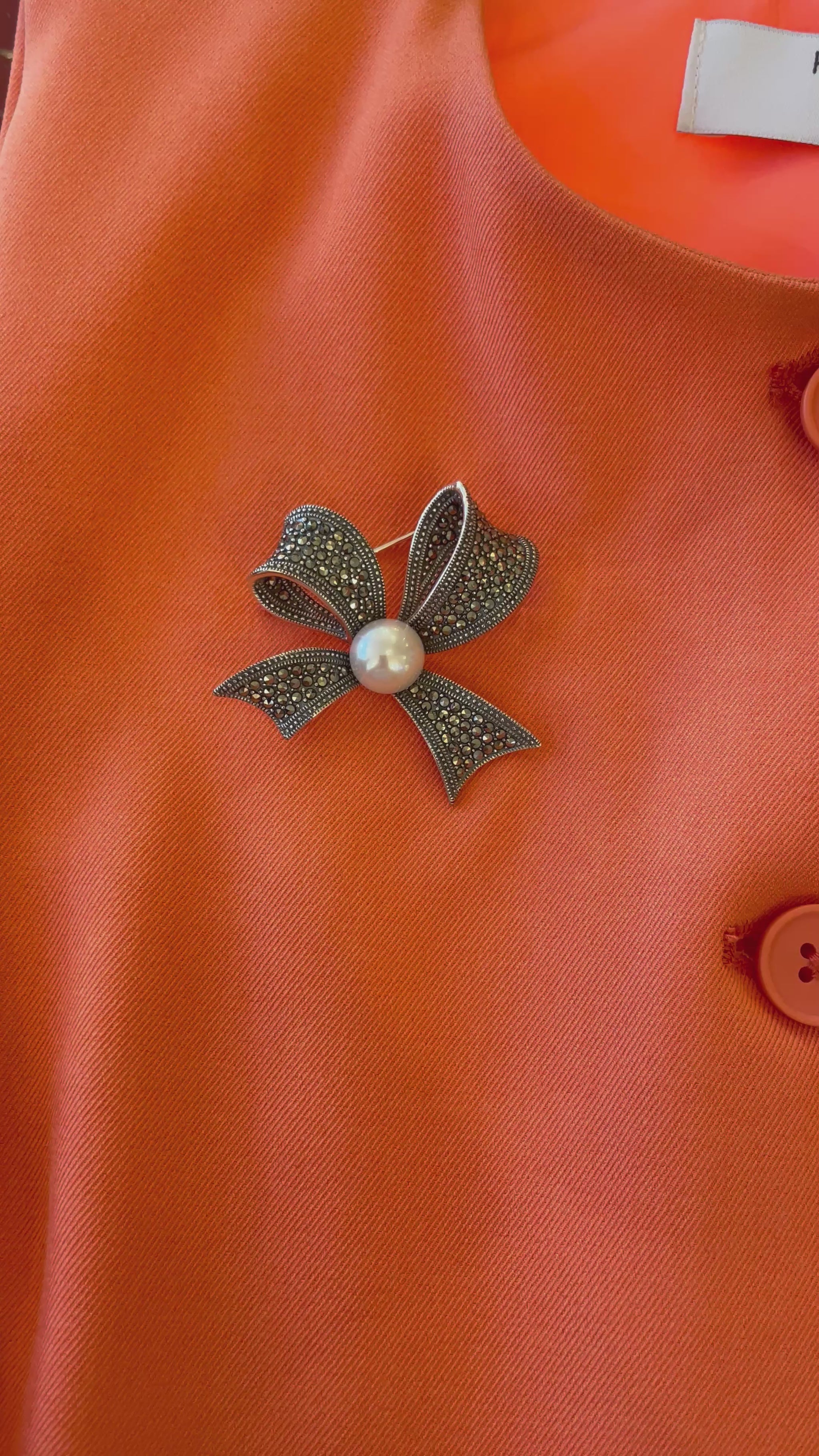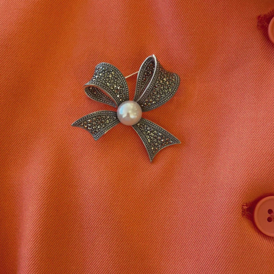 Silver Marcasite & Pearl Ribbon Bow Brooch