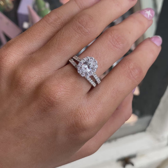 Claw set Oval CZ Solitaire with CZ set shoulders and the matching wedding band/eternity ring.
