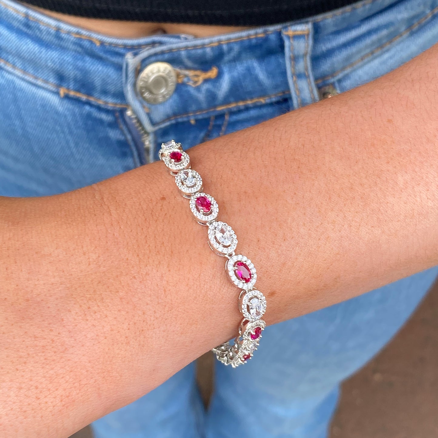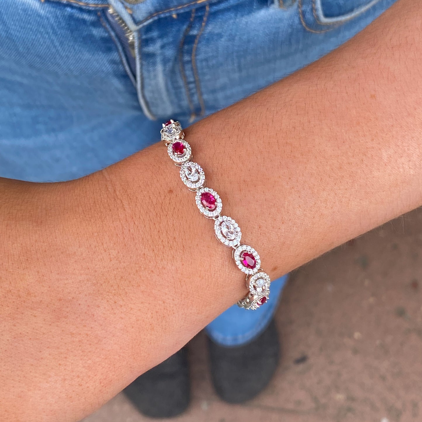 Silver Oval Halos CZ Line Bracelet | Ruby Red
