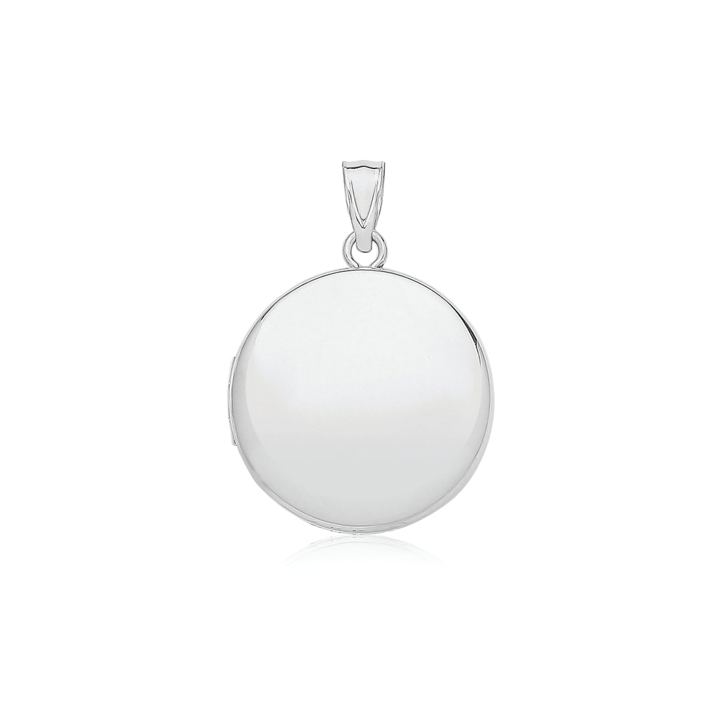 This 925 silver medium to large round locket holds two photos. It has plain polished finish on both sides, a 20mm diameter and can be engraved. It hangs from a 18" Rhodium Plated Sterling Silver Cable Chain. This is so classic and stylish. A completely "wear anytime" piece.