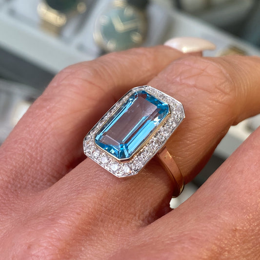 9ct Gold Elongated Blue Topaz & Diamond Ring