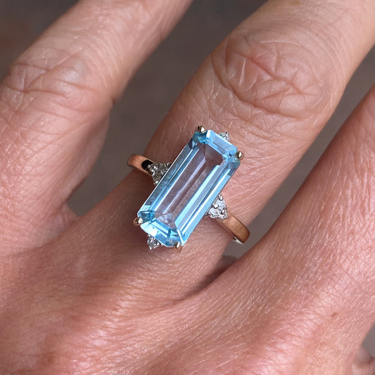 9ct Gold Elongated Blue Topaz & Diamond Ring