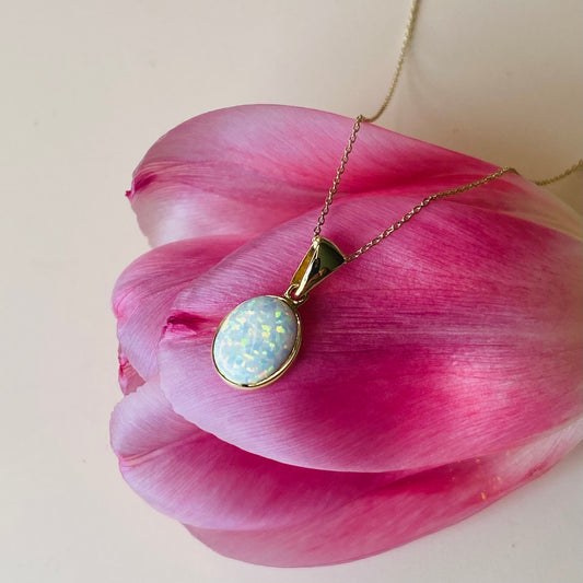 9ct Gold Oval Opalique & CZ Pendant Necklace