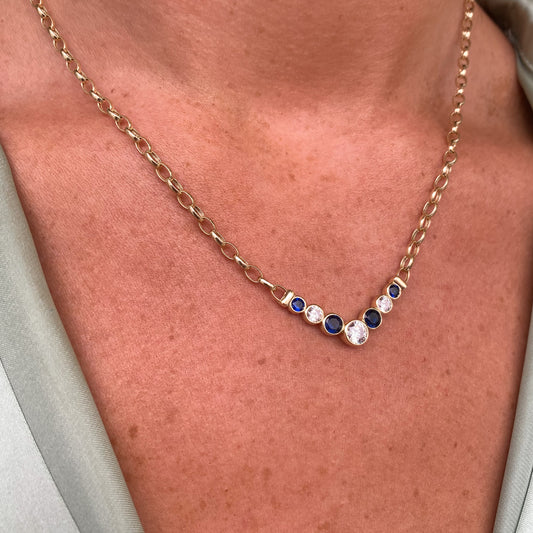 9ct Gold Wishbone Necklace | Sapphire Blue & White CZ