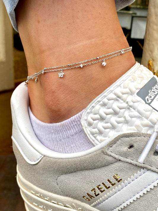 Silver Anklet - Double Chain with CZ | 23-26cm
