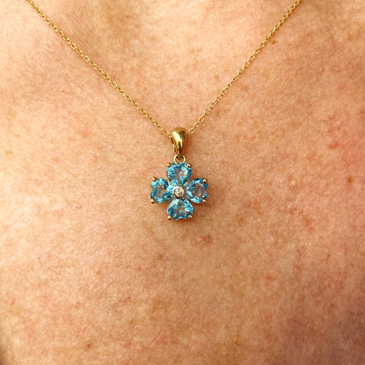 9ct Gold Blue Topaz & Diamond Quatrefoil Necklace