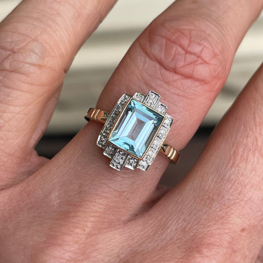 9ct Gold Blue Topaz, Sapphire & Diamond Deco Ring