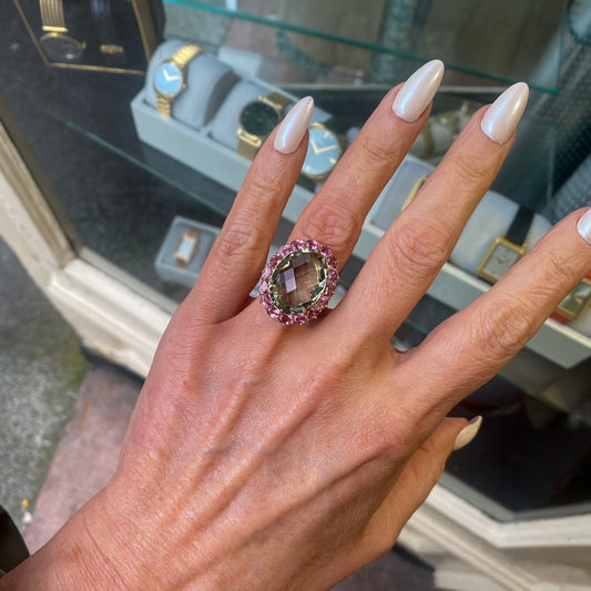 9ct Gold Green Amethyst & Pink Tourmaline Cocktail Ring