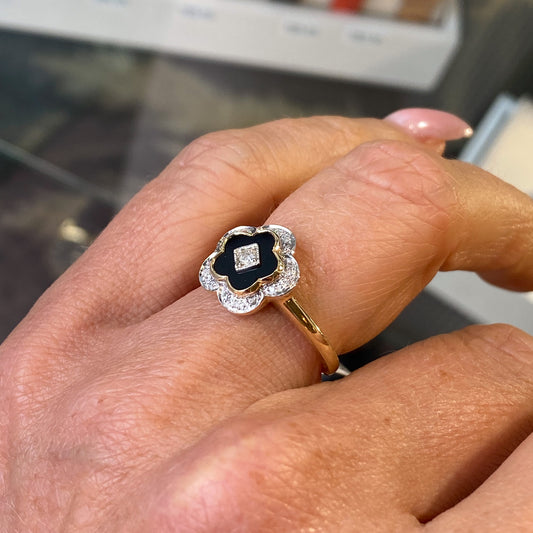 Sold out9ct Gold Onyx & Diamond Flower Ring