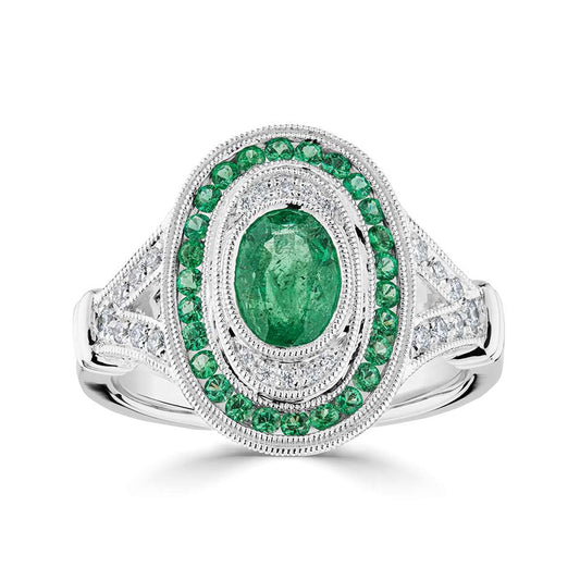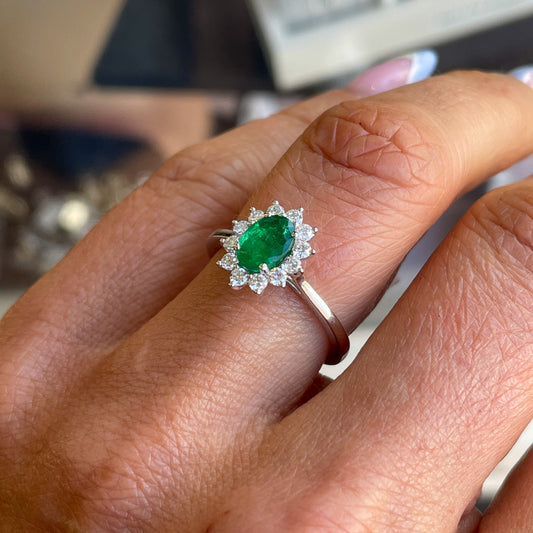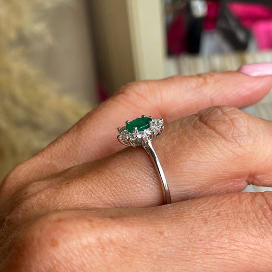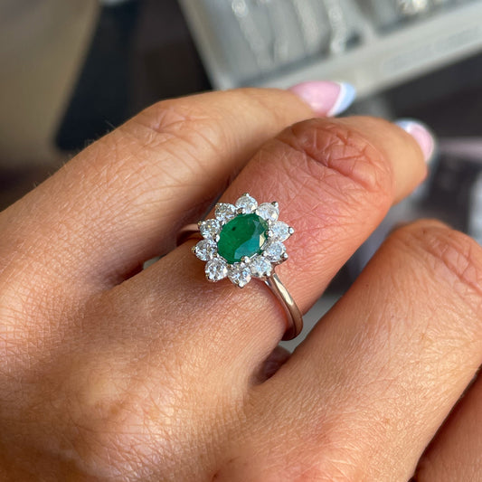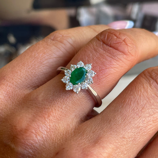 Platinum Emerald & Diamond Oval Cluster Ring | 1.28ct + 0.51ct