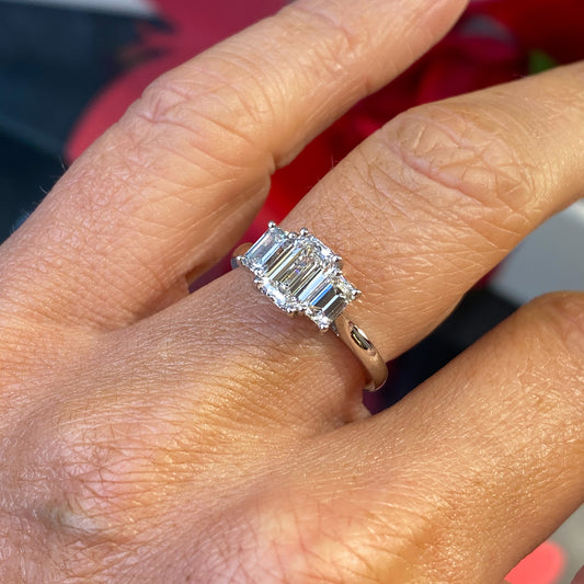 Platinum Emerald Cut Trilogy Diamond Engagement Ring | 1.68ct Certificated