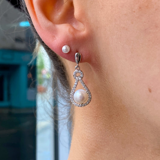 Silver Freshwater Pearl & CZ Drop Earrings