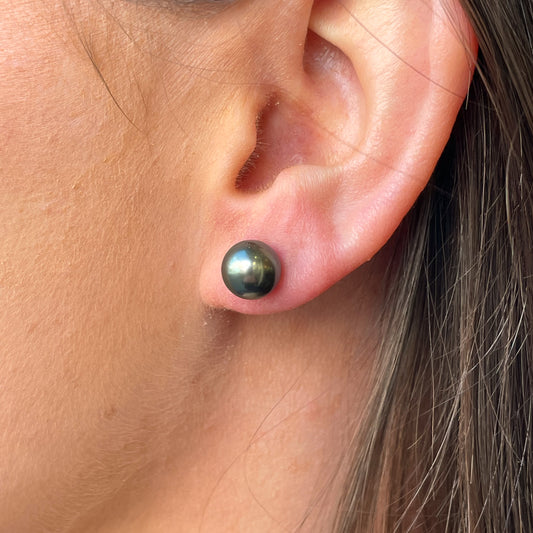 14ct White Gold Dark Green Tahiti Pearl Stud Earrings | 8-9mm