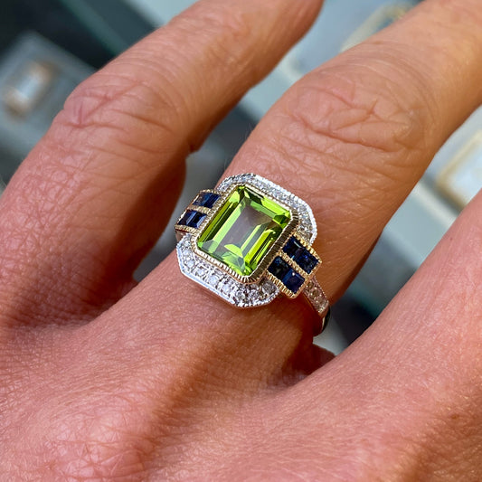9ct Gold Peridot, Sapphire & Diamond Ring