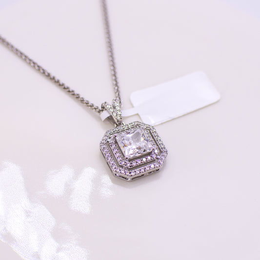 Silver Princess CZ Square Double Halo Pendant Necklace