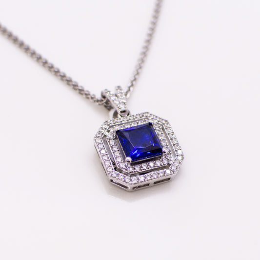 Silver Created Sapphire & CZ Square Double Halo Pendant Necklace