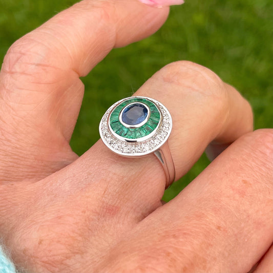 9ct White Gold Sapphire, Emerald & Diamond Ring