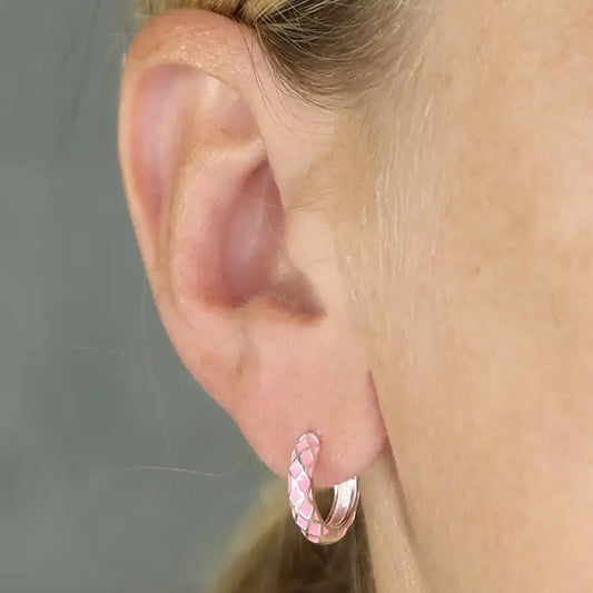 Silver Baby Pink Enamel Snakeskin Huggie Hoop Earrings | 14mm